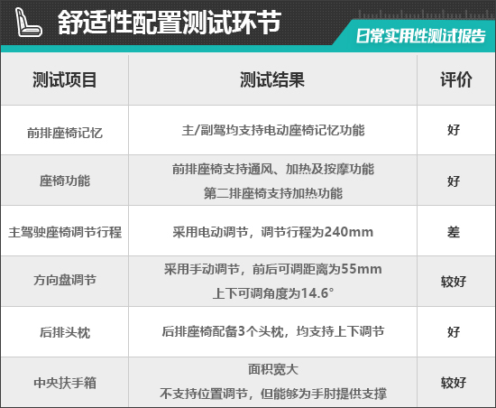 在主驾驶座椅测试中,评测车的主驾驶座椅最前端和最末端之间的距离为240mm,在测试过的同级别车型中处于下游水平,座椅可调节行程较短。