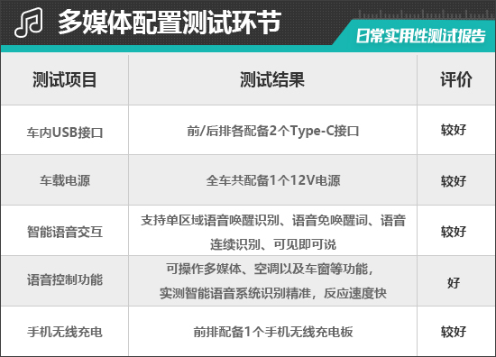 经过实测,评测车能够识别全部指令,语音识别准确,反应速度较快。此外,评测车还支持语音连续识别以及可见即可说,日常使用十分便捷。不过可惜的是,语音分区域唤醒识别仅支持单区域,未达到目前行业的主流水平。