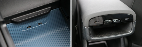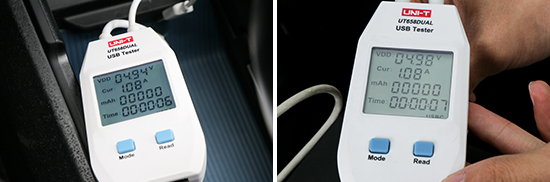 在车内USB接口方面,评测车前/后排均配备2个USB Type-C接口,数量比较可观,只是种类较为单一。与此同时,全车还配备了1个12V电源。此外,我们对USB接口的电压与电流进行了测试,综合来看,前/后排USB Type-C接口的电压和电流基本都能达到5V和1A。