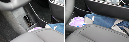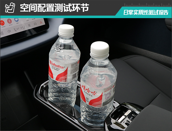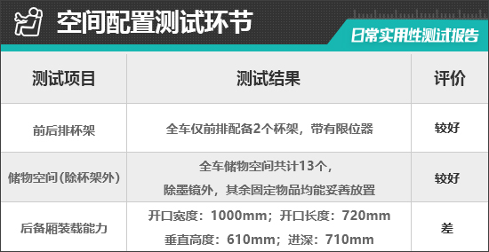 对于车内使用空间的测试,只针对前排触手可及的空间,不包括手套箱、中央扶手箱等需开启的空间。测试方法是将以下固定物品全部放置在前排的各个储物空间内,通过固定物品的放置情况来判断车辆储物空间的表现。测试选定的固定物品为:2瓶常规大小的矿泉水、1部大屏手机、1支口红、1个挎包、1副墨镜、1把折叠雨伞以及1包常规尺寸的抽纸。