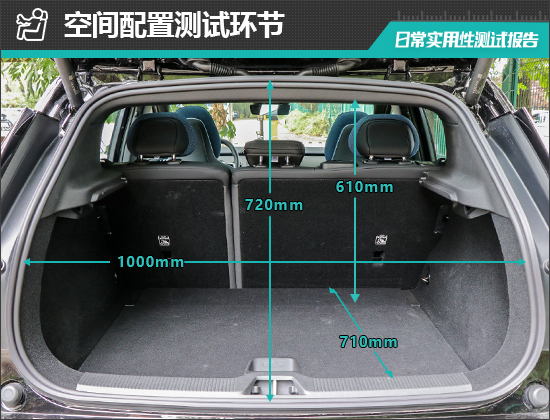 对于2025款沃尔沃EX30后备厢的基础数值,我们也进行了实测,开口长度为720mm;开口宽度为1000mm;后备厢进深为710mm;后备厢地台与顶部的垂直高度为610mm。由于这四项测试数据均低于测试过的同级别车型平均值,因此表现欠佳。
