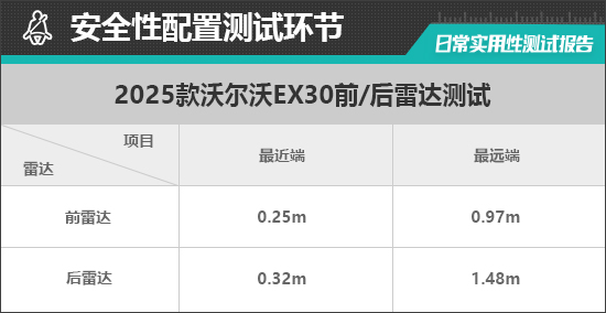 在测试过程中,倒车雷达在1.48m处可感应到后方物体,雷达功率表现尚可。参考往期测试经验,持续蜂鸣阶段越接近0.25m则越贴近日常使用习惯。从实测数据来看,2025款沃尔沃EX30倒车雷达持续蜂鸣提示距离与测试经验值略有差距,驾驶者需要主动适应。