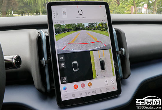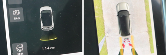 评测车配备了360度全景影像,画面清晰度和畸变控制都比较不错。此外,影像画面内还配备了可随动的泊车辅助线,实用性表现出色。屏幕左下角是驻车雷达的显示区域,根据实测数据对比来看,其显示的车辆与障碍物距离较为精准,能够为驾驶员提供参考。