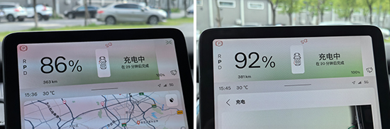 此外,对于充电效率我们也进行了测试。实测人员使用快充桩充电10分钟后(波峰用电),电量从86%充至92%,续航里程增加18km,与车辆电脑预计的用时基本吻合。