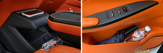 对于车内使用空间的测试,只针对前排触手可及的空间,不包括手套箱、中央扶手箱等需开启的空间。测试方法是将以下固定物品全部放置在前排的各个储物空间内,通过固定物品的放置情况来判断车辆储物空间的表现。测试选定的固定物品为:2瓶常规大小的矿泉水、1部大屏手机、1支口红、1个挎包、1副墨镜、1把折叠雨伞以及1包常规尺寸的抽纸。