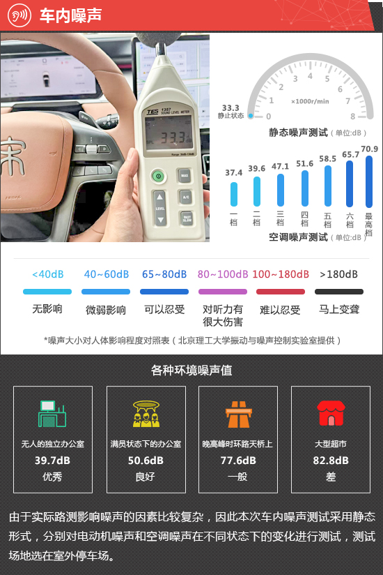 在静态噪声测试环节,2025款比亚迪宋L EV智驾版在静止状态下车内实测噪声值为33.3dB。由于评测车搭载纯电动力系统,车辆启动后不会出现明显的噪音。