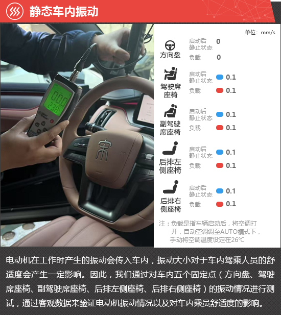 在静态车内振动测试环节,启动后静止和负载两种状态下,方向盘处的振动数值始终为0。同时,车内座椅的振动数值也处于较低水平且两种状态下没有变化,对乘坐舒适性未造成影响。