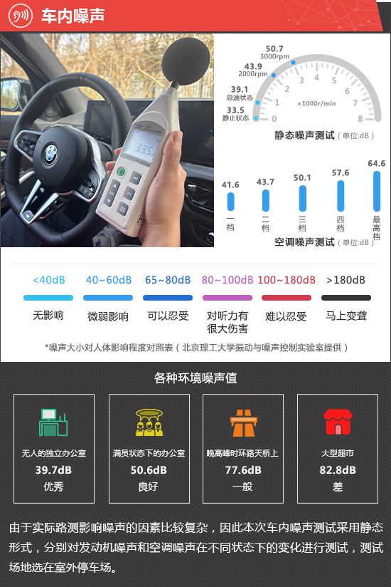 在静态噪声测试环节,2025款华晨宝马3系在静止状态下车内实测噪声值为33.5dB。随着发动机启动,传入车内的噪声值呈现出逐渐增大的趋势,从测试数据来看,发动机在怠速、2000转和3000转时,传入车内的噪声值分别为39.1dB、43.9dB和50.7dB。其中,发动机在3000转时传入车内的噪声值低于同级别平均水平,表现令人满意。