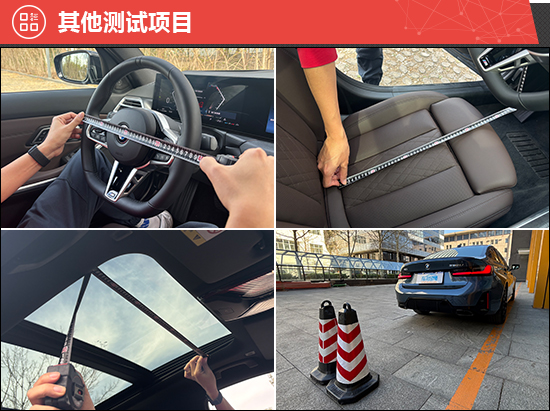 此外,我们还针对驻车雷达、灯光/视野、操控系统、轮胎、天窗、座椅、后备厢进行了测试。经过测试,2025款华晨宝马3系的方向盘上下调节范围较小,难以适应不同身高的驾驶员坐姿。同时,两侧外后视镜的视野盲区略大,前/后驻车雷达长鸣提示的距离过近,停车时需谨慎操作。另外,后排座椅不支持角度调节和比例放倒,后备厢空间扩展能力受到制约。值得肯定的是,评测车配备倍耐力P Zero系列轮胎,主打性能和操控,具备出色的干湿地制动性能,轮胎规格为前225/45 R18、后255/40 R18。