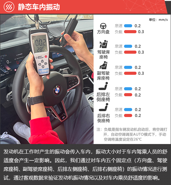在静态车内振动测试环节,怠速状态下,2025款华晨宝马3系全车的振动数值保持一致。负载状态下,方向盘、驾驶席座椅和副驾驶席座椅数值略有升高,或与更靠近发动机有关,不过实际体感并不明显。
