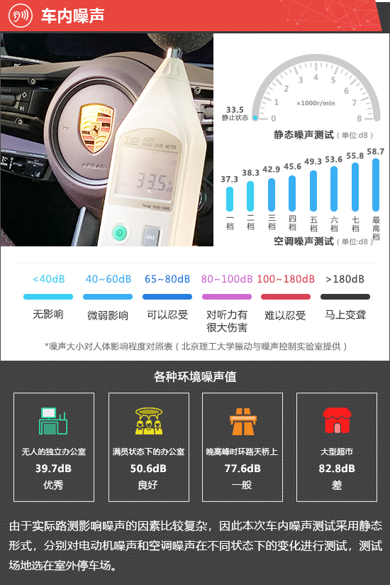 在车内空气质量测试环节,将车辆放置在车辆较少的内部地面停车场中,实测评测车的车内甲醛含量为0.01mg/m3,符合2012年3月1日起实施的,由原环保部和国家质量监督检验检疫总局联合发布的《乘用车内空气质量评价指南》(中华人民共和国国家标准GB/T 27630-2011)中的相关标准。