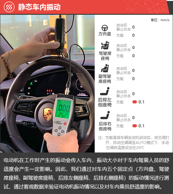 在静态车内振动测试环节,启动后静止和负载两种状态下,评测车方向盘位置、驾驶席座椅、副驾驶席座椅的振动数值始终为0,后排座椅在负载状态下的振动数值为0.1mm/s,实际体感非常轻微。