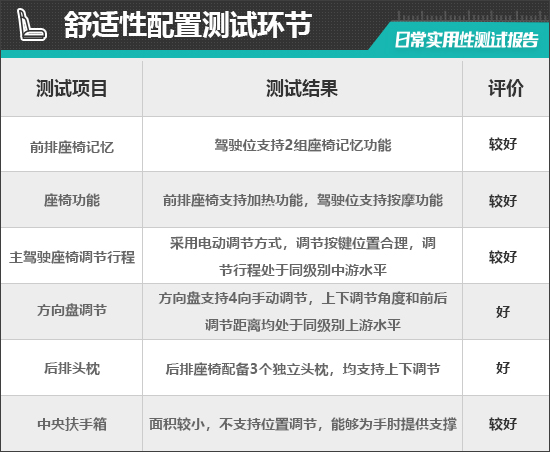 在主驾驶座椅测试中,评测车的主驾驶座椅最前端和最末端之间的距离达到250mm,在测试过的同级别车型中处于中游水平,能够满足大部分驾驶者的使用需求。