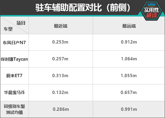 驻车辅助配置方面,在前驻车雷达测试中,根据已有测试数据来看,保时捷Taycan和蔚来ET7最远探测距离均超过1m,后者更是达到了1.855m,雷达功率表现不错。最近提示距离方面,四款车或多或少与测试均值存在差距,其中华晨宝马i5与测试均值差距较大。