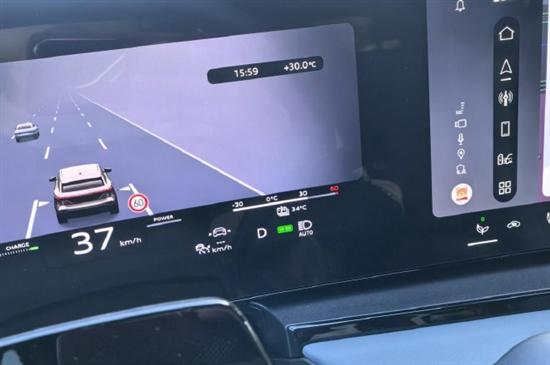 动能回收通过方向盘后的拨片来调整,在仪表盘上清楚显示两档,它的回收功率至高为220kW,能提供至高0.3G减速度,官方表示其覆盖95%的日常工况,甚至可应用在ABS激活的工况,从而进一步提高车辆能效与制动表现,但最强模式下,它的动能回收力度仍旧是保守的。