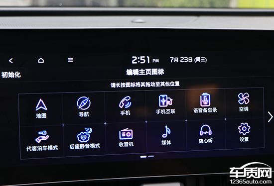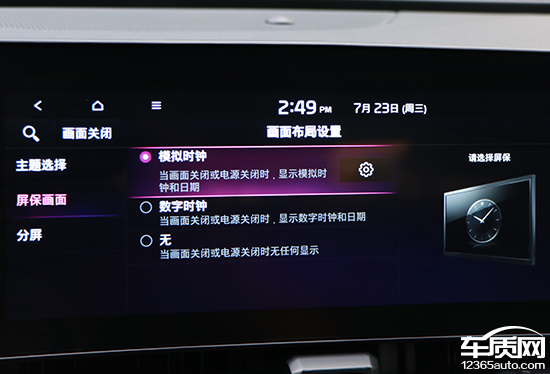 车机主题选择只限于液晶仪表的显示内容,中控屏的相关设置可以说是少得可怜,仅提供了不同的屏保画面布局,用户可以选择模拟时钟、数字时钟或者直接关闭。系统界面美观性一般,好在内容显示的清晰度还算不错,实用性方面没有明显硬伤。主页图标支持自定义编辑,不过只是长按拖动至其他位置,可操作空间不大。