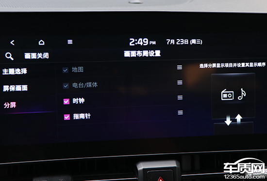 系统支持分屏显示,不过形式非常初级且单一,仅能够显示预设的功能内容,例如地图以及时钟等。用户需要提前选择好分屏显示项目并设置其显示顺序,实际使用体验比较一般,功能稍显鸡肋。