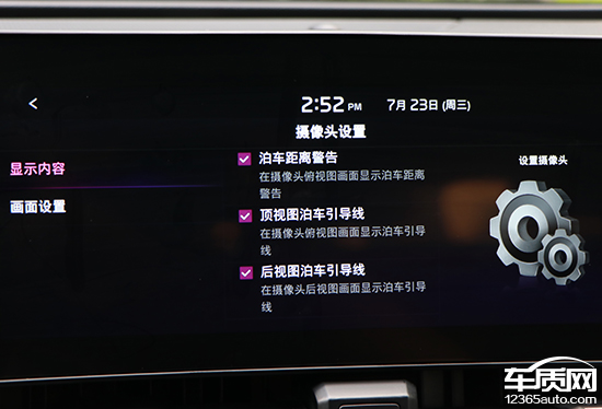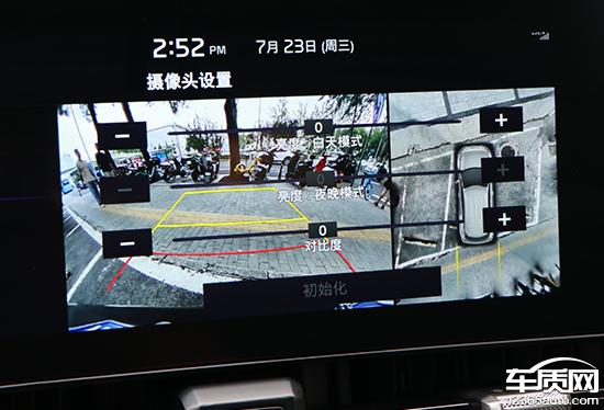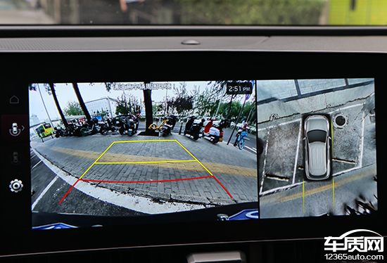 评测车配备360°全景影像,支持多角度显示。虽然画面清晰度比较一般,但是提供了摄像头设置进行弥补,包括亮度以及对比度。畸变控制令人满意,这点表现得很好。此外,影像画面内还带有可随动的倒车辅助线,能够为驾驶员提供参考。