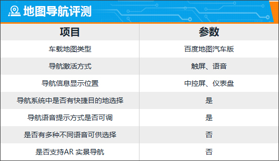 评测车内置百度地图汽车版,界面采用常规布局,搜索栏位于左上角,支持多种输入方式。除了“回家”、“去公司”以及收藏夹内的地点外,导航还预设了很多快捷目的地选择,例如加油站、卫生间、酒店以及景点等。