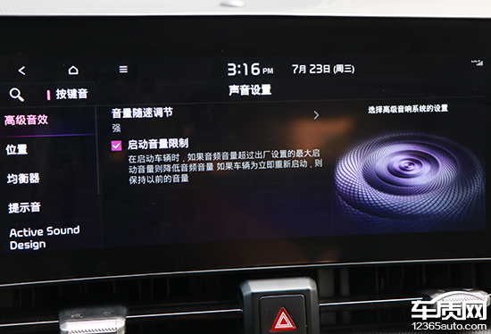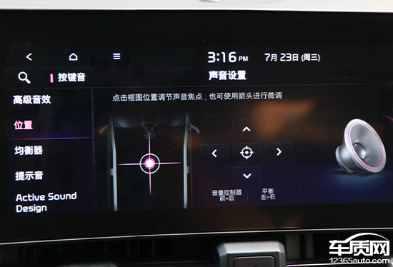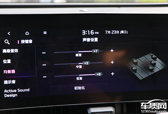 评测车配备Harman/Kardon哈曼卡顿音响系统,拥有8个扬声器。软件层面,系统内提供了丰富的声音设置和功能调节,包括音量随速调节、声音焦点、高级音效以及均衡器等。