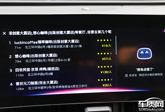 实测后发现,当说出“我有点饿了”后,系统会快速查询附近的咖啡店及餐馆,并导航前往。不过,当接收到另外三个指令后,系统不是保持沉默就是表示“我还不清楚”,对于模糊语义的识别能力不强,交互体验并不好。