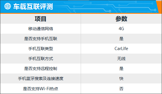 车载互联部分,评测车支持4G车联网以及手机APP远程功能,另外手机蓝牙的搜索及连接速度都相当不错,日常使用体验感较好。手机互联方面,系统仅支持CarLife,适配性表现比较一般。