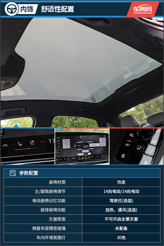 舒适性配置方面,评测车前排配备了专为中国用户定制的“云感座椅”,可调节腿托,配合超宽侧翼支撑、高密度支撑泡沫与加厚海绵层,确保了激烈驾驶时座椅的侧向支撑和整体舒适性。同时,不可开启全景天窗支持9分区电致变色技术,遮光区域灵活多变,可有效阻挡阳光对车内的侵袭。