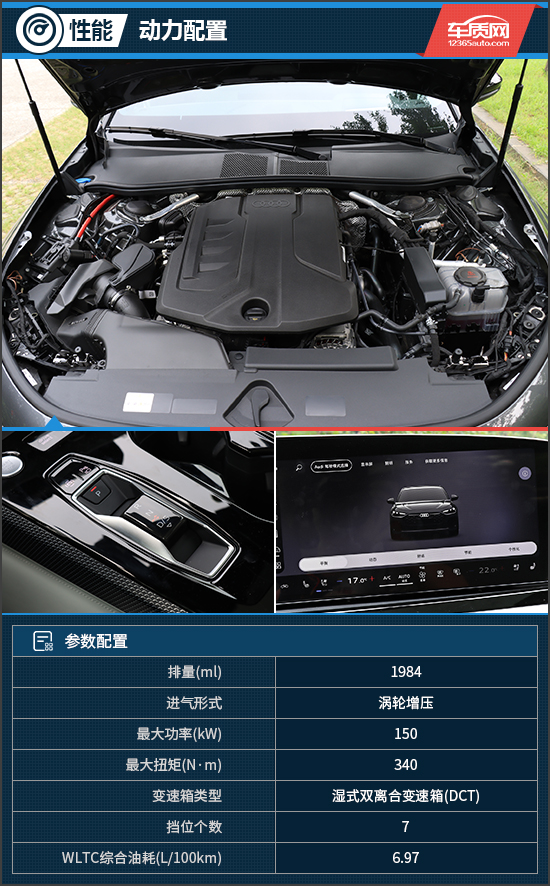 评测车搭载第五代EA888 2.0T涡轮增压发动机,最大功率150kW,峰值扭矩340N·m,匹配7速湿式双离合变速箱。发动机配备源自保时捷911的VTG可变截面涡轮增压技术,兼顾了高转速的动力性和低转速的响应性,真正实现“低速不肉,高速不虚”。