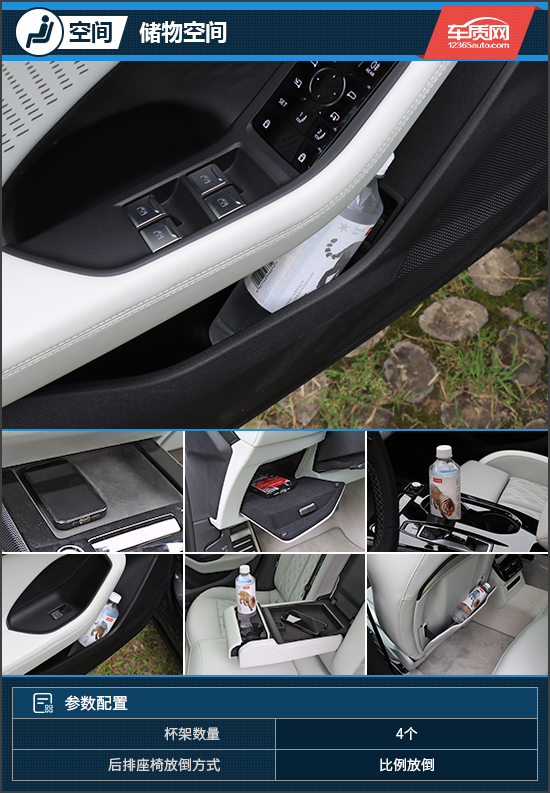 储物空间方面,车内储物空间数量适中,布局和容积都比较合理。前排中控台配备了手机无线充电功能,充电功率达到40W,并且提供了散热口,这在传统豪华品牌车型上并不常见。