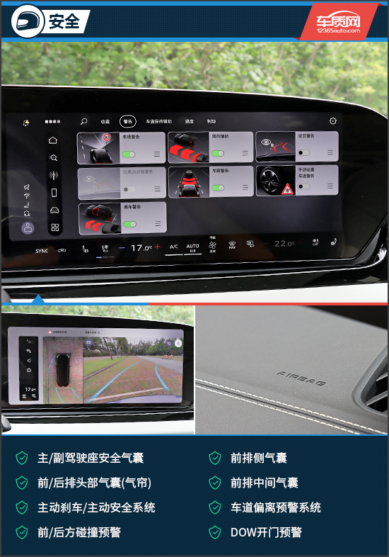 评测车提供了较为丰富的主动和被动安全功能,如时下主流的前排中间气囊、前/后方碰撞预警以及DOW开门预警等功能均有配备,能够大幅降低出事故的风险,确保日常的行车安全。