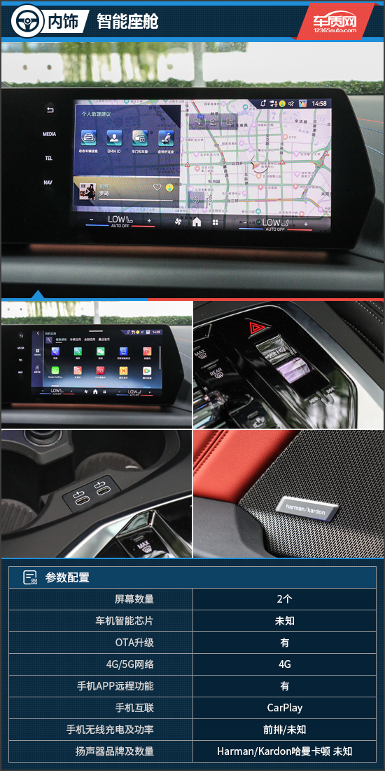 车机采用iDrive 9系统,主页为模块化布局,功能上内置多个第三方APP,并且支持CarPlay互联,满足当下消费者使用需求。同时,中控屏的下方还设置了手机无线充电板,提升了日常便利性。