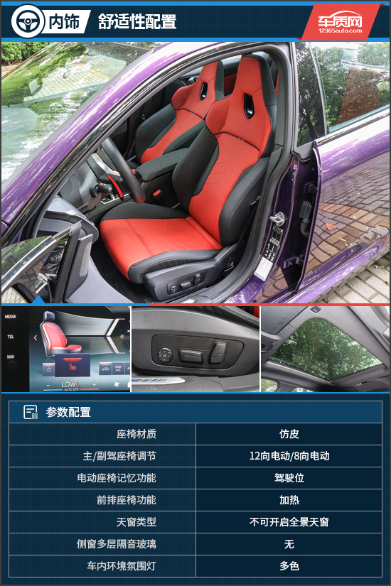虽然华晨宝马M235L是台性能车,但舒适性表现还算不错。前排座椅内部填充物柔软适中,座垫较长,配合包裹性较强的侧翼,长时间驾驶也不会疲劳。同时,前排座椅还支持3档加热功能。另外,车顶采用不可开启全景天窗,为后排乘客带来不错的通透感。