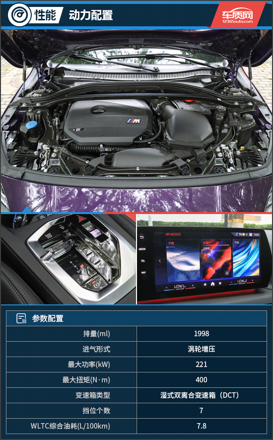 动力方面,评测车搭载B48 2.0T涡轮增压发动机,最大功率221kW,最大扭矩400N·m,匹配7速湿式双离合变速箱。官方百公里加速5s,WLTC综合油耗为7.8L/100km。