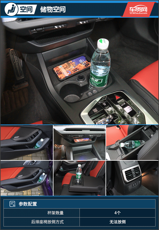 虽然这是台性能车,但储物方面也做到了令人满意。中控屏下方有两个储物槽,后方是两个水杯架,打开中央扶手,内部的容积也比较可观。后排除设计了后门板储物槽外,中央扶手内部还提供了两个带限位器的杯架。