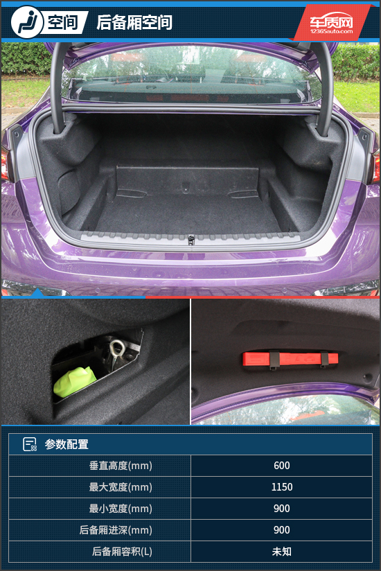 打开后备厢,内部布局规整,并且下潜深度可观。常规状态下,可容纳3到4个登机箱。不过由于后排座椅不支持放倒,因此影响其扩展能力。