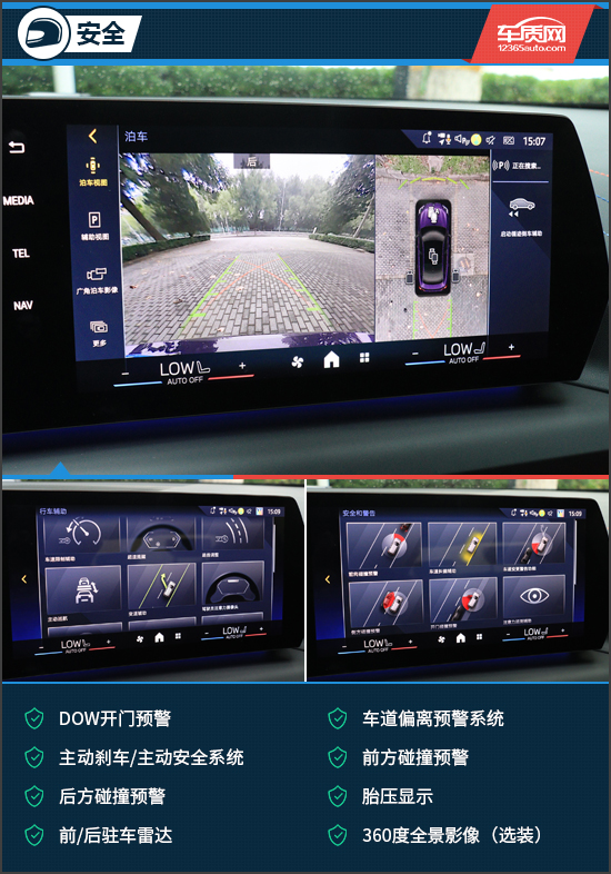 安全方面,评测车配备了诸多安全配置,包括DOW开门预警、车道偏离预警系统、主动刹车/主动安全系统、胎压显示等。同时,评测车还选装了360度全景影像。实测来看,其画质较为清晰,畸变程度也在可控范围内,实用性出色。
