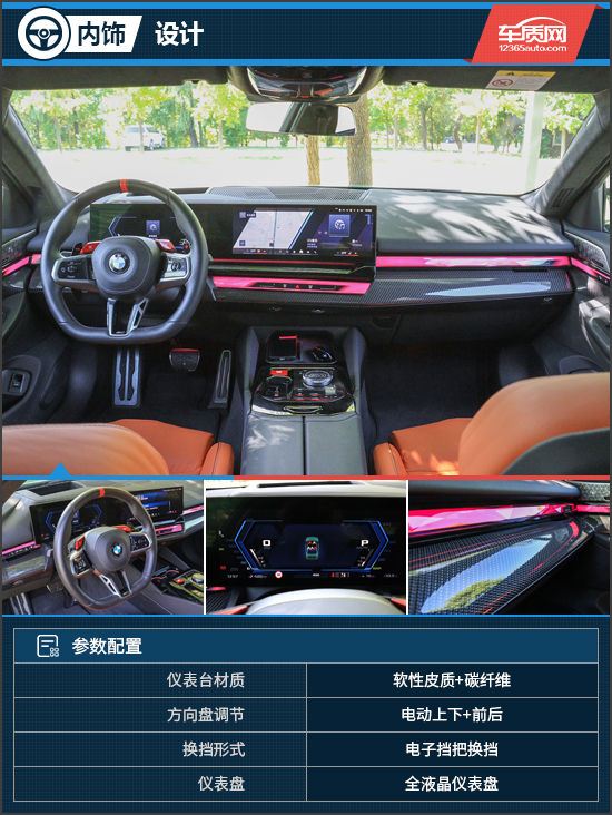 进入车内,熟悉的宝马M家族气息扑面而来。中控台选用大量碳纤维材质进行装饰,再辅以较宽的氛围灯带,使其在豪华质感与科技氛围之间取得了出色平衡。方向盘的上方不仅设有回正标识,两侧还配有经典的M1、M2快捷键,能够让你迅速进入战斗状态。