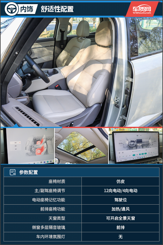 舒适性方面,前排座椅内部填充物较为柔软,再辅以加热/通风功能,舒适性表现不错。另外,评测车还配备可开启全景天窗和前排侧窗多层隔音玻璃,提升驾乘体验感。略有遗憾的是,其并未提供年轻消费者喜爱的车内环境氛围灯。
