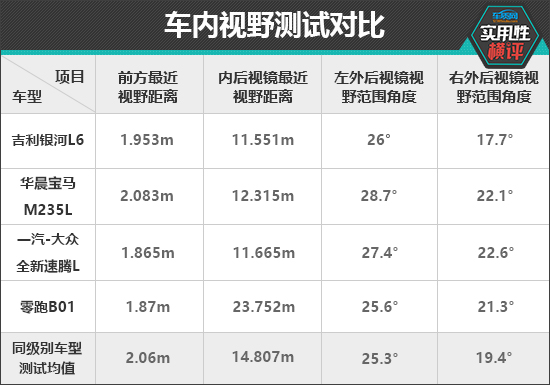 实测过程中,银河L6和零跑B01的前方视野测试成绩均达到同级别车型上游水平,宝马M235L的前方视野测试成绩虽然排名垫底,但也达到同级别中游水平,表现同样可圈可点。在内后视镜最近视野距离测试中,只有零跑B01的测试成绩未达到同级别车型测试均值,后方视野盲区相对较大。