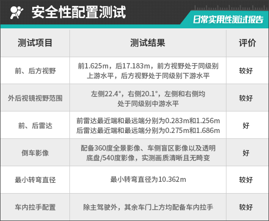 评测车的左/右外后视镜均采用普通镜片,经实测,左、右外后视镜视野范围分别为22.4°和20.1°,均处于同级别中游水平。