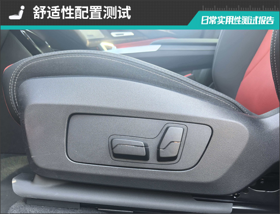座椅方面,评测车前排座椅电动调节按键位于座垫侧面,位置合理且操作方便,驾驶位配备电动座椅记忆功能。座椅舒适功能上,评测车前排座椅选装了加热功能,寒冷环境下可以提供更为舒适的乘坐体验。