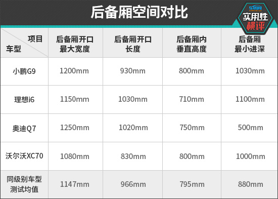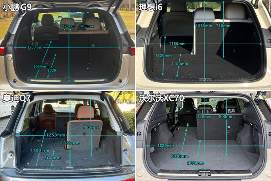 后备厢空间方面,小鹏G9和理想i6分别有三项测试数据超越同级别车型测试均值,表现可圈可点。而奥迪Q7和沃尔沃XC70分别有两项数据未达到同级别车型测试均值,后备厢空间表现仍需提高。