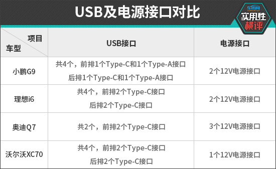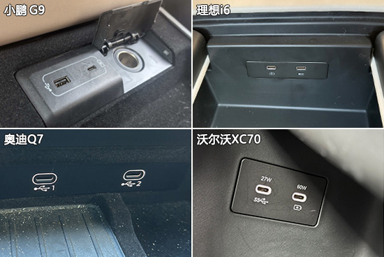 充电接口方面,小鹏G9表现最佳,前后排均提供Type-C与Type-A接口组合,并配备2个12V电源接口,整体使用场景更为丰富。相比之下,其余三款车型仅提供Type-C接口,接口类型略显单一。其中,奥迪Q7的USB接口数量最少,但通过3个12V电源接口,在一定程度上弥补了用户的用电需求。