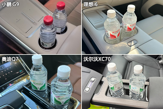 杯架测试中,奥迪Q7由于采用了三排7座布局,提供了6个杯架,数量上优于其他三款车型。但第三排2个杯架未配备限位器,对水杯或水瓶的固定能力较差。