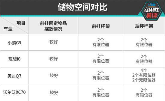 综合来看,本期参与对比的四款中大型SUV在实用性方面的表现可以令人满意。当然,四款车型也都存在需要改进的地方,例如小鹏G9主驾驶座椅前后移动距离较短,理想i6两侧后视镜可视范围略小,奥迪Q7第三排杯架没有限位器,沃尔沃XC70前驻车雷达探测能力较弱等。不过瑕不掩瑜,消费者可根据自身需求选择合适的车型。