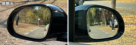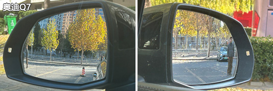 在外后视镜视野范围测试中,奥迪Q7与沃尔沃XC70的左侧外后视镜均采用双曲率镜片。同时,两车在测试数据上占据明显优势,左右外后视镜的视野范围均大幅领先同级别车型测试均值,为驾驶者提供了更为宽阔的视野。相比之下,理想i6两项测试数据均未达到同级别车型测试均值,两侧后视镜的可视范围处于劣势。