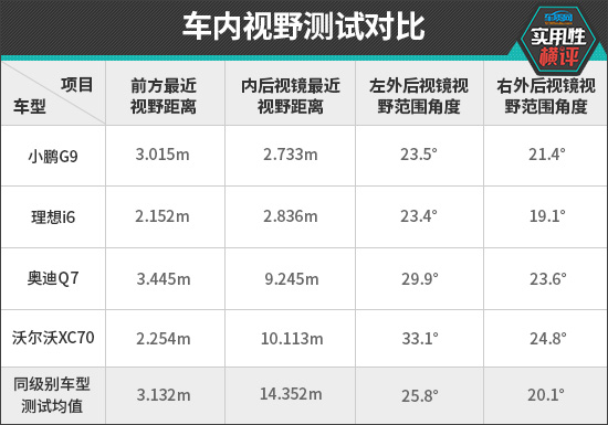 实测过程中,理想i6的前方最近视野距离和小鹏G9的内后视镜最近视野距离表现最佳,测试成绩全部达到同级别上游水平。相比之下,四款车型中仅奥迪Q7的前方最近视野距离测试成绩未达到同级别车型平均水平,前方视野盲区偏大。
