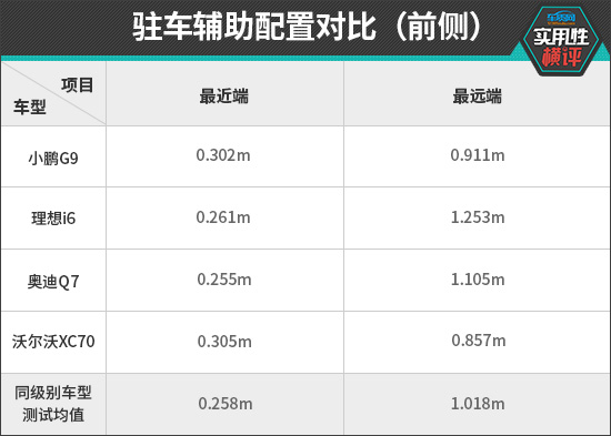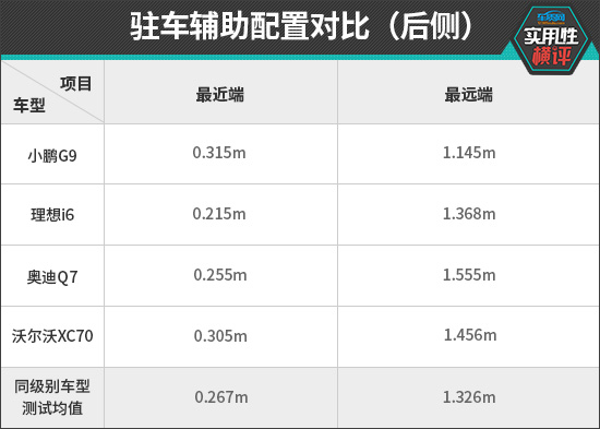 在后驻车雷达测试中,奥迪Q7展现出最强的探测能力,最远探测距离达到1.555m。同时,其最近提示距离也更接近同级别车型测试均值,整体表现优于其他三款车型。