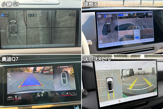 在影像辅助系统方面,四款车型均配备了360度全景影像,小鹏G9和理想i6还额外搭载了透明底盘/540度影像功能。经实测,除理想i6画面四周存在较小畸变外,其他车型画面清晰度以及畸变控制都较为不错,影像画面内都带有可随动的倒车辅助线,能够为驾驶员提供参考,实用性表现出色。