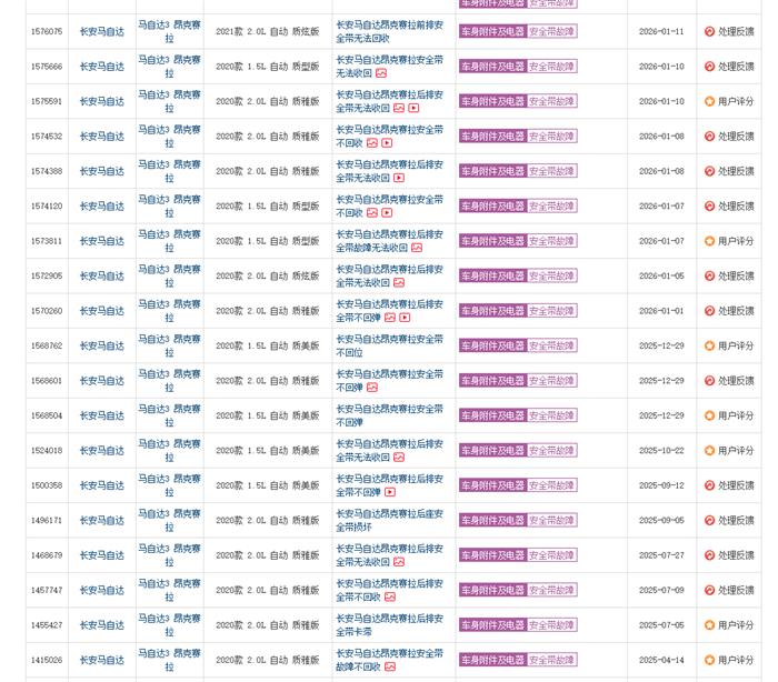 车辆安全带无法自动收回,主副驾已经发现两年多时间了,后排因未使用过还没看,之前以为是时间久了不回弹,现在发现好多车友有同类型的问题,这种情况存在一定的安全隐患,希望引起重视。